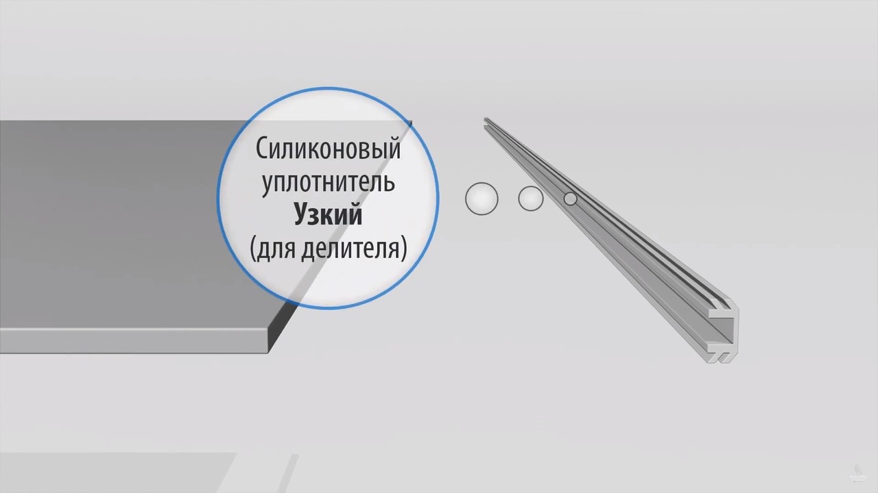 Сборку начинают со стекла. К верхней стороне прикрепляется силиконовый уплотнитель, между вставками - делители. На стекло – узкий силиконовый уплотнитель.