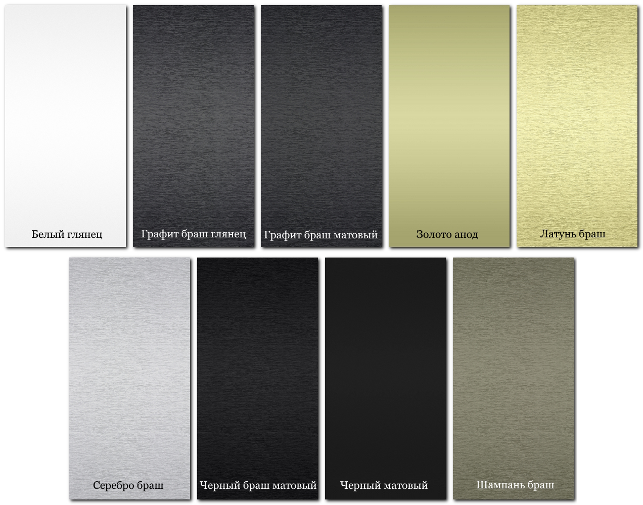 Добавлены цвета: Белый глянец, Графит браш глянец, Графит браш матовый, Золото анод, Латунь браш, Серебро браш, Черный браш матовый, Черный матовый, Шампань браш.