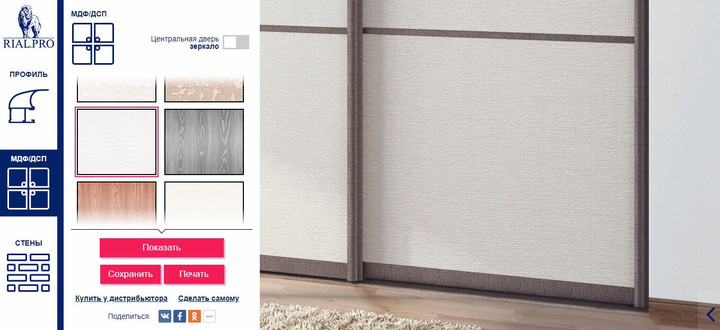 А чтобы поделиться с друзьями своим индивидуальным дизайном шкафа-купе, вы можете отправить ссылку на нужный проект (включая социальные сети и т.д.) или сохранить и распечатать Вашу работу.