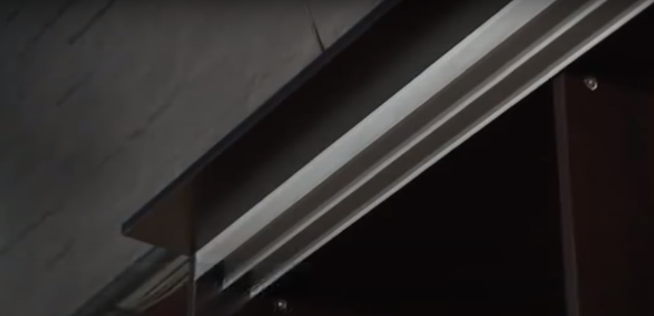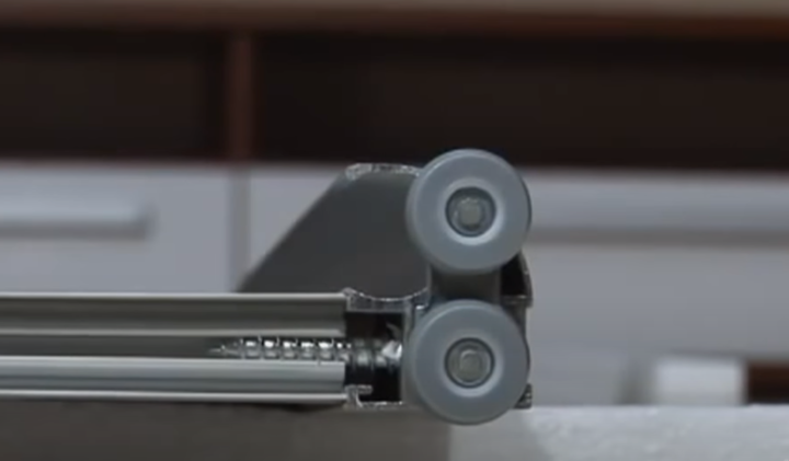 Чтобы закрепить дверное полотно системы к потолку, в верхнюю ходовую направляющую устанавливают два ролика. Крепим ее саморезами к потолку, после чего система подвешивается на четырехгранную головку винта ролика.