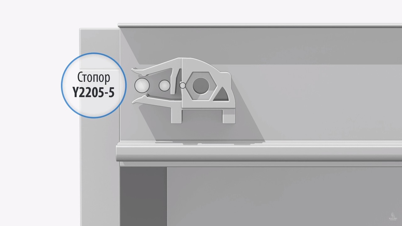 Следующий этап - навеска дверных полотен, за которым следует установка стопорного фиксатора внутренней двери. Его необходимо расположить внутри ходового верхнего профиля. Для каждой дверной перегородки применяют по два фиксатора. Закрытое положение фиксатора исключает самопроизвольный сход роликов с направляющих.