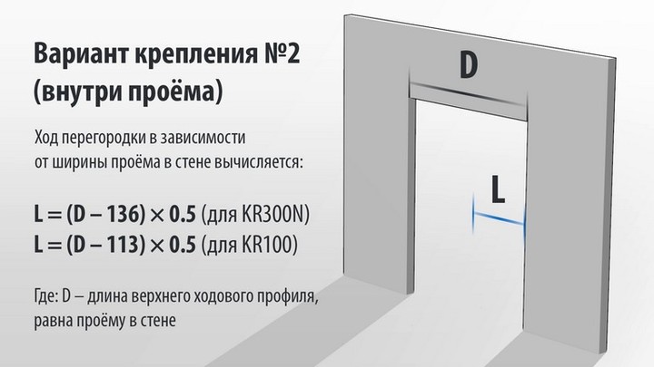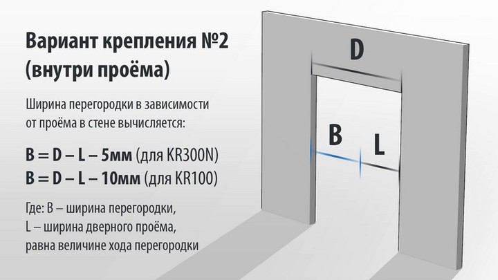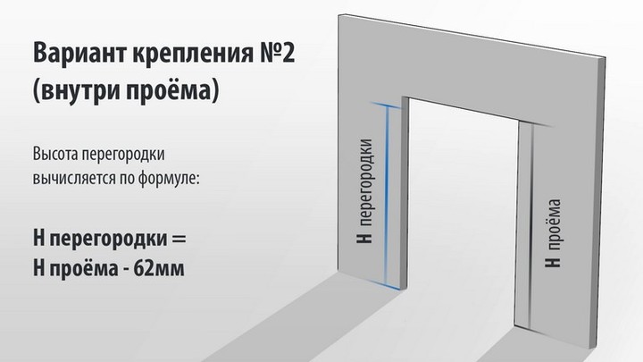 Второй вариант крепления осуществляется внутри. Вот формула, по которой вычисляется высота: Н перегородки = H дверного проема – 62 мм