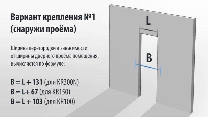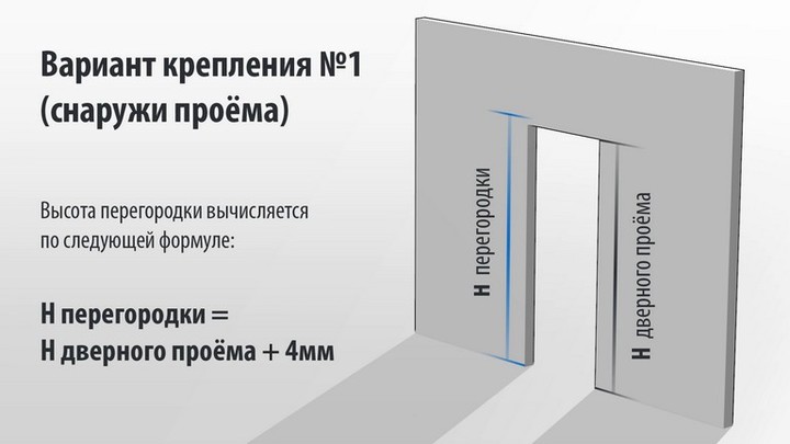 Замеряем высоту и ширину проема. Вычисляем параметры перегородки. Первый вариант крепления осуществляется снаружи. Вот формула, по которой вычисляется высота: Н перегородки = H дверного проема + 4mm