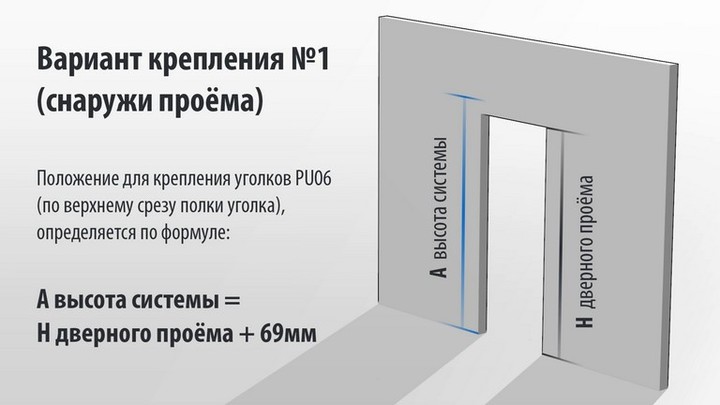 Положение для крепления уголков PU06 можно вычислить, используя следующую формулу: А высота системы = Н дверного проема + 69 мм Данный расчет приведен для крепления по верхнему срезу полки уголка.