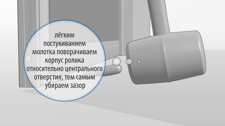 Теперь при помощи молотка поворачиваем корпус ролика относительно центрального отверстия. Легонько постукивая инструментом, убираем зазор.Вновь снимаем перегородку.