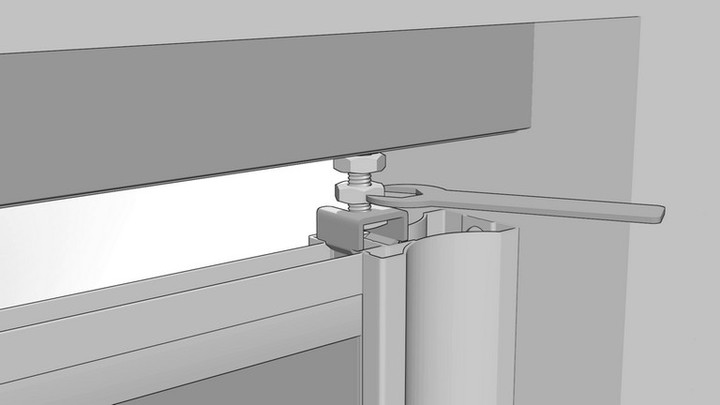 Чтобы осуществить крепление одностворчатой перегородки системы к потолку, в верхний ходовой профиль PU01 необходимо установить два верхних колесика PU10. Крепим профиль к потолку саморезами М 3.5x 51. После этого собранная система навешивается на четырехгранную головку винта колесика PU-10.