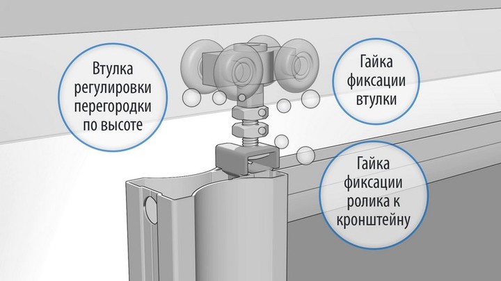 Отладка выполняется посредством вращения втулки регулировки перегородки по высоте. После осуществляется закрепление гайкой фиксации колесика к кронштейну, при этом удерживается втулка перегородки по высоте.