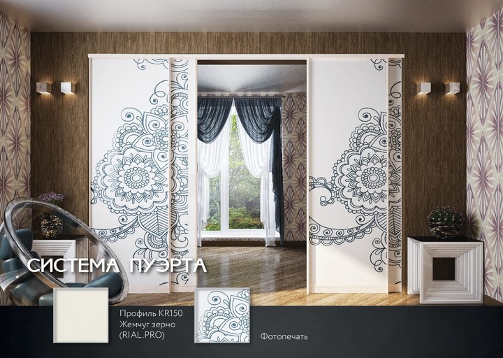 Особого внимания здесь заслуживает такой вариант, как беспогоровая система «Пуэрта», созданная на основе раздвижной системы «Рамир». Дизайн дверей и размеры, как правило, выполняют по индивидуальному заказу. Профиль друг под друга подгоняют, подбирая оптимальный вариант габаритов проема, а также дверной конструкции.
