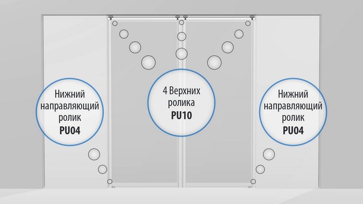 Для определения правильного положения нижнего ролика перегородку двигают в закрытое положение. Ролик должен занять правильное положение автоматически. Если используется двухстворчатая перегородка, необходимо сомкнуть две перегородки. Такое положение будет считаться закрытым. Установка роликов аналогична для каждой из перегородок.